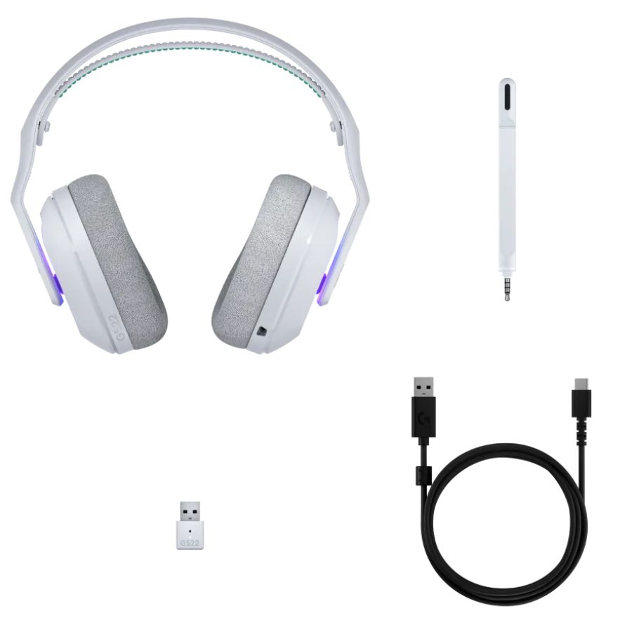 Contenido de la caja : Auriculares inalámbricos G522 LIGHTSPEED, receptor inalámbrico USB-A LIGHTSPEED, cable USB-A a USB-C, micrófono extraíble, documentación del usuario